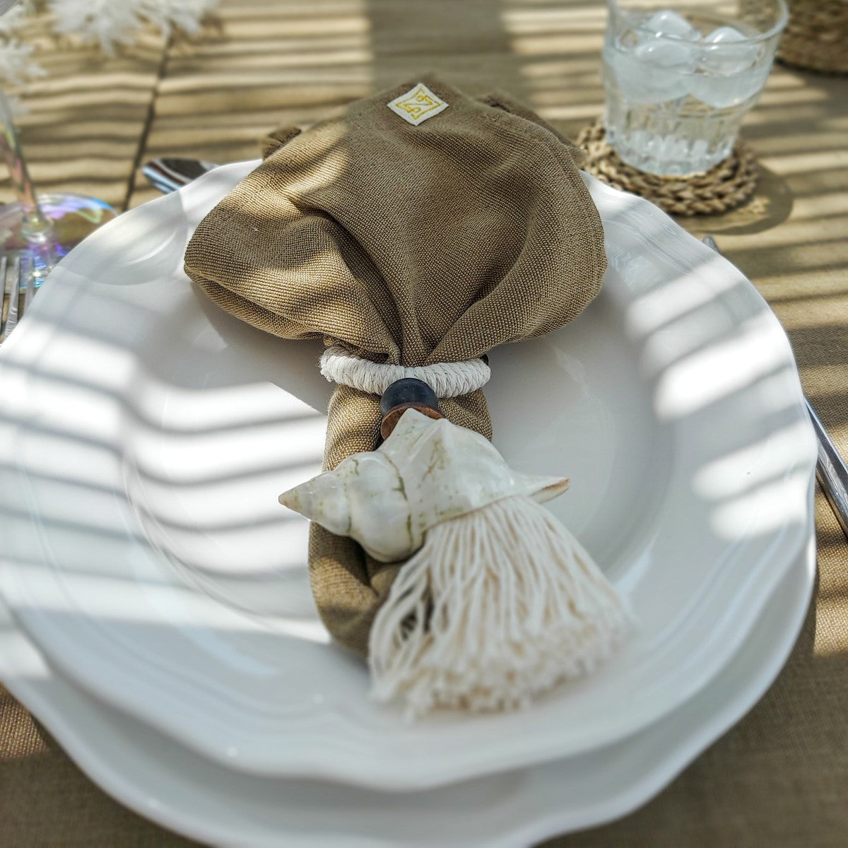 Enhance this bohemian theme with our natural napkin rings, crafted from wood and shells. These napkin rings complement the off-white tablecloth beautifully, adding a rustic charm that blends seamlessly with the coastal-inspired design.