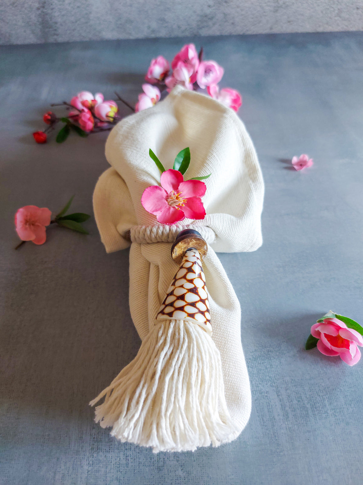 - Handmade Napkin Rings: Our napkin rings, crafted from natural materials, such as wood, cotton and shells, add an artisanal touch. They feature designs that complement the macrame and shells, bringing everything together beautifully.
